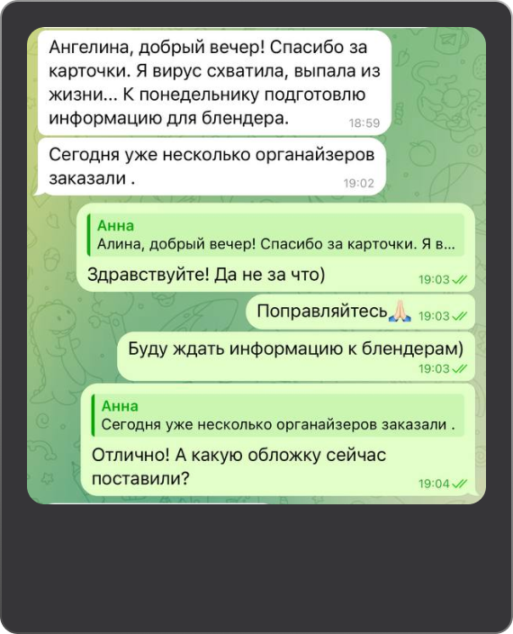 Если хочешь сделать заказ, нажми на кнопку, выбери вариант связи, дождись пока попадешь в чат и напиши в диалоге “Заказать карточки"